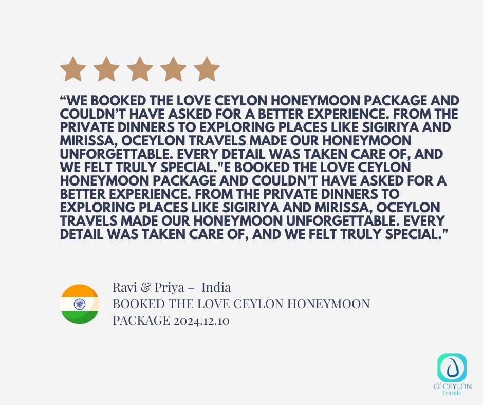 Embark on a romantic journey with Love Ceylon, our exclusive honeymoon package. Designed for couples seeking intimate and unforgettable experiences, this package offers stunning beach sunsets, cozy hill station retreats, and luxurious accommodations. Celebrate your love amidst the enchanting beauty of Sri Lanka and create memories that will last a lifetime.